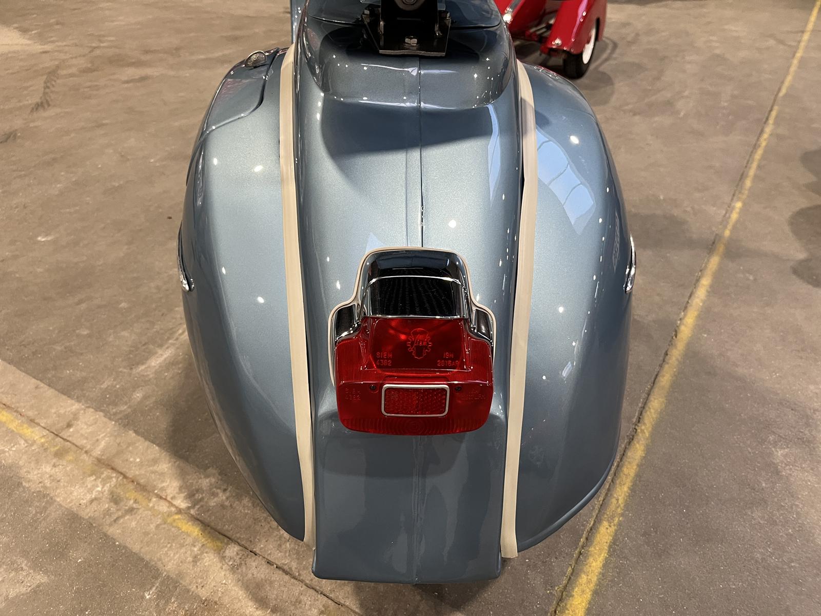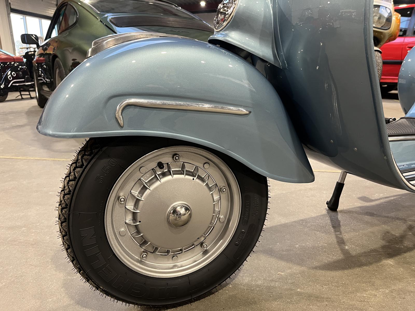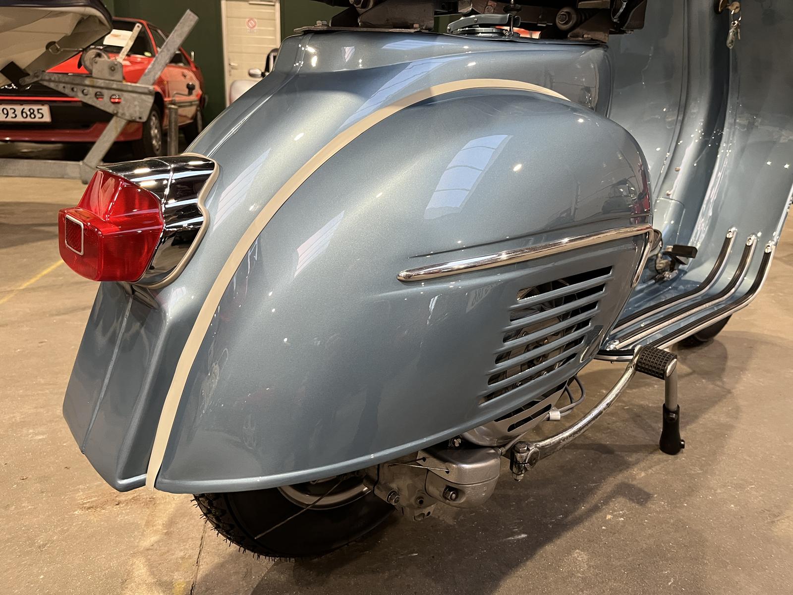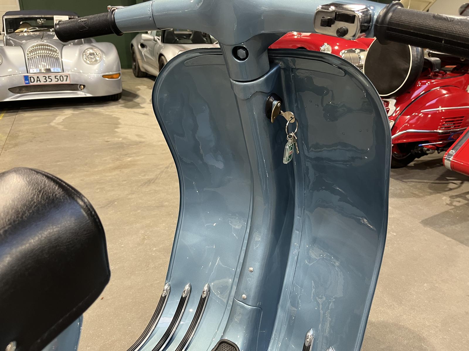 Scooteren har fået den helt store tur, og står super flot i en elegant metalblå farve, som virkelig fremhæver det klassiske Vespa-design. Det bliver ganske enkelt ikke meget bedre for en samler eller entusiast.