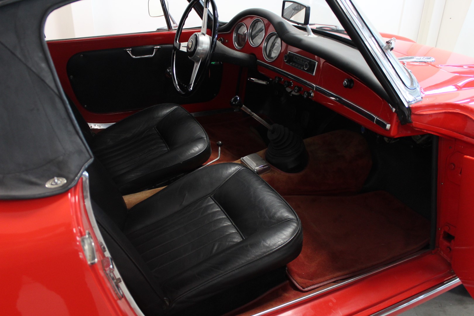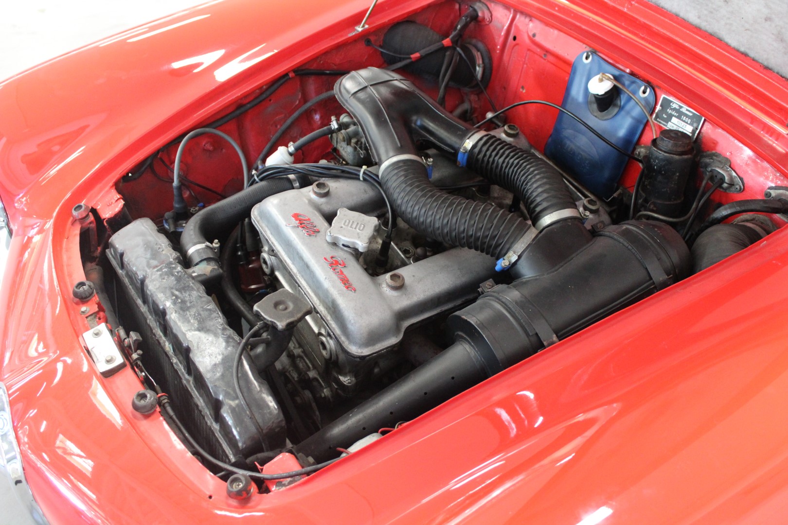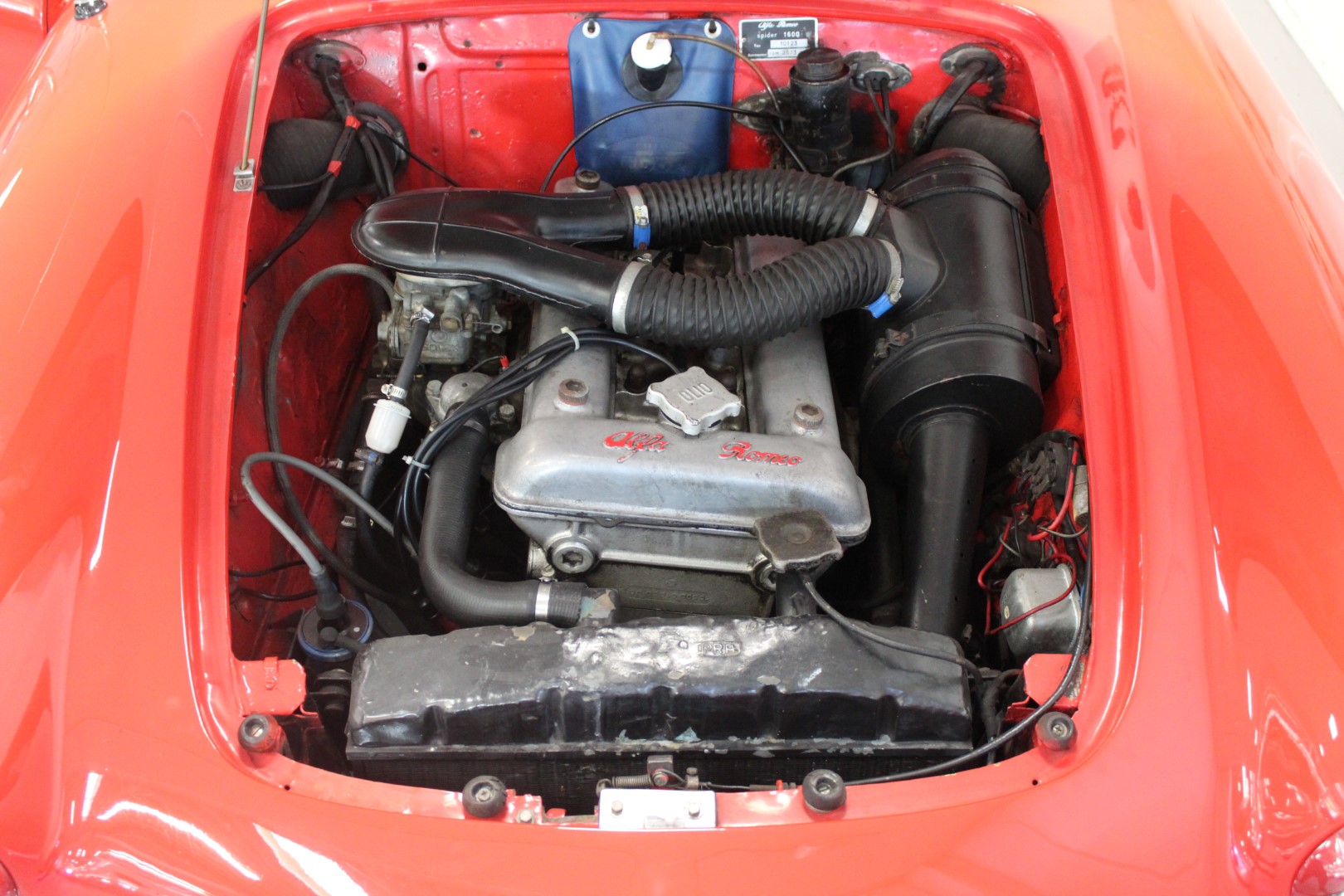 Alfa Romeo Giulia 1600 Spideren står med danske papirer og registreringsafgift betalt, og den leveres med sorte emaljeplader, som fuldender udtrykket på denne italienske klassiker.