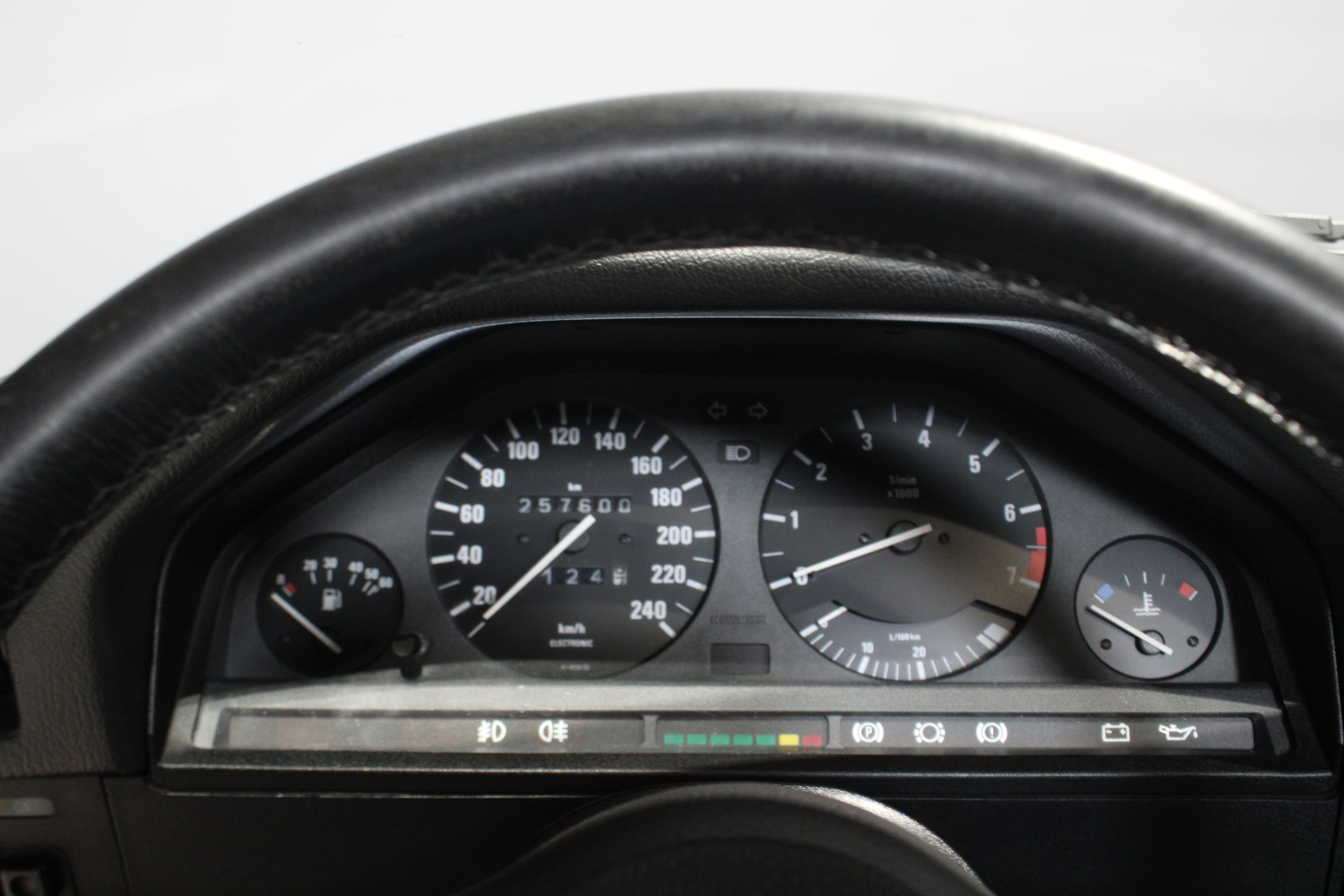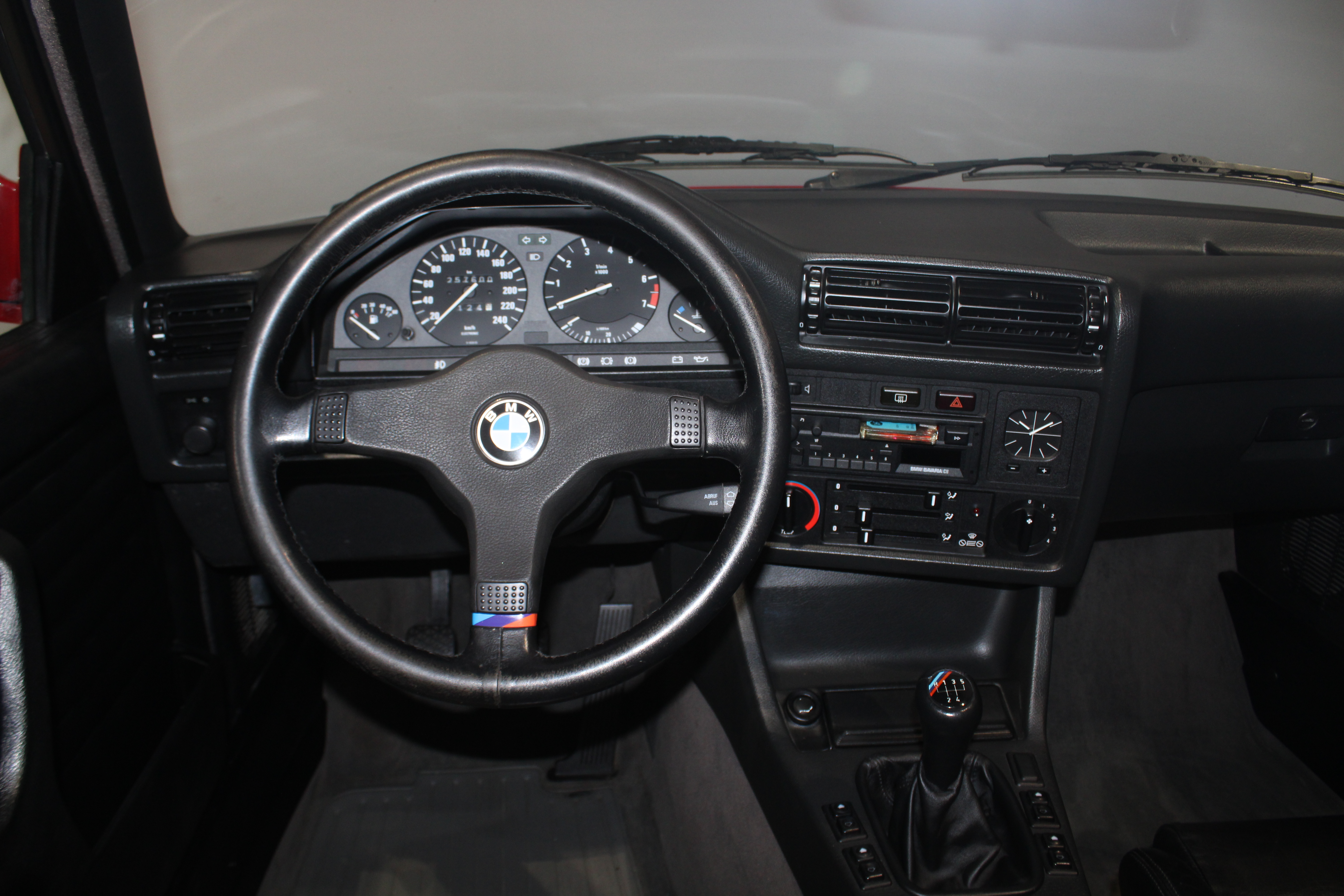 Bilen fremstår flot og velholdt og bemærk er udstyret med sorte M-sportssæder, rat og gearknop samt original BMW Bavaria autoradio med cassette