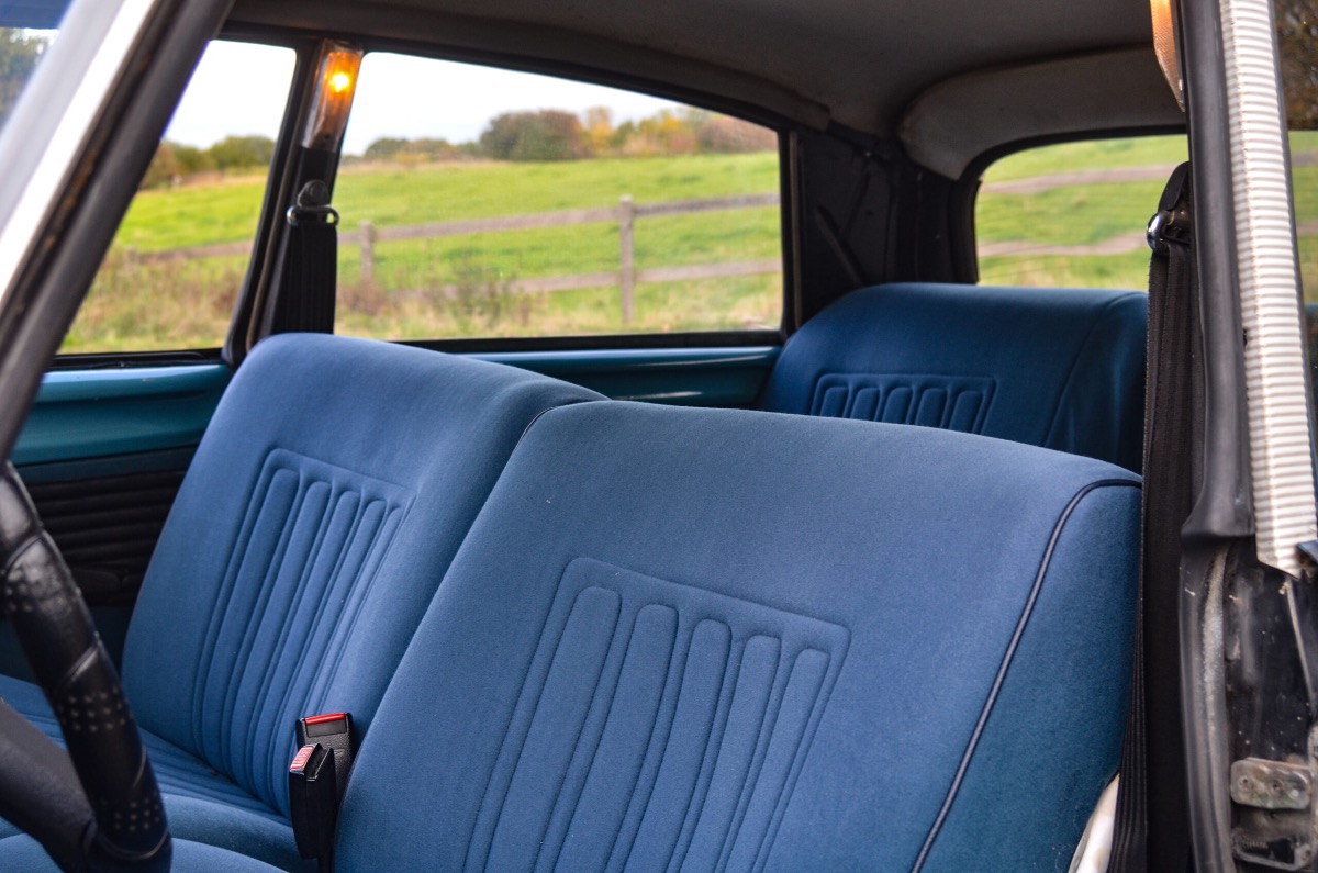 Dog er der tale om en bil, der er blevet brugt – og elsket. Man vil finde patina her og der, samt marginalt rust. Interiøret er nyligt istandsat med nyt betræk i den rigtige farve sæder, som løfter kabinen.