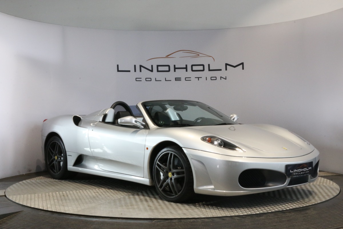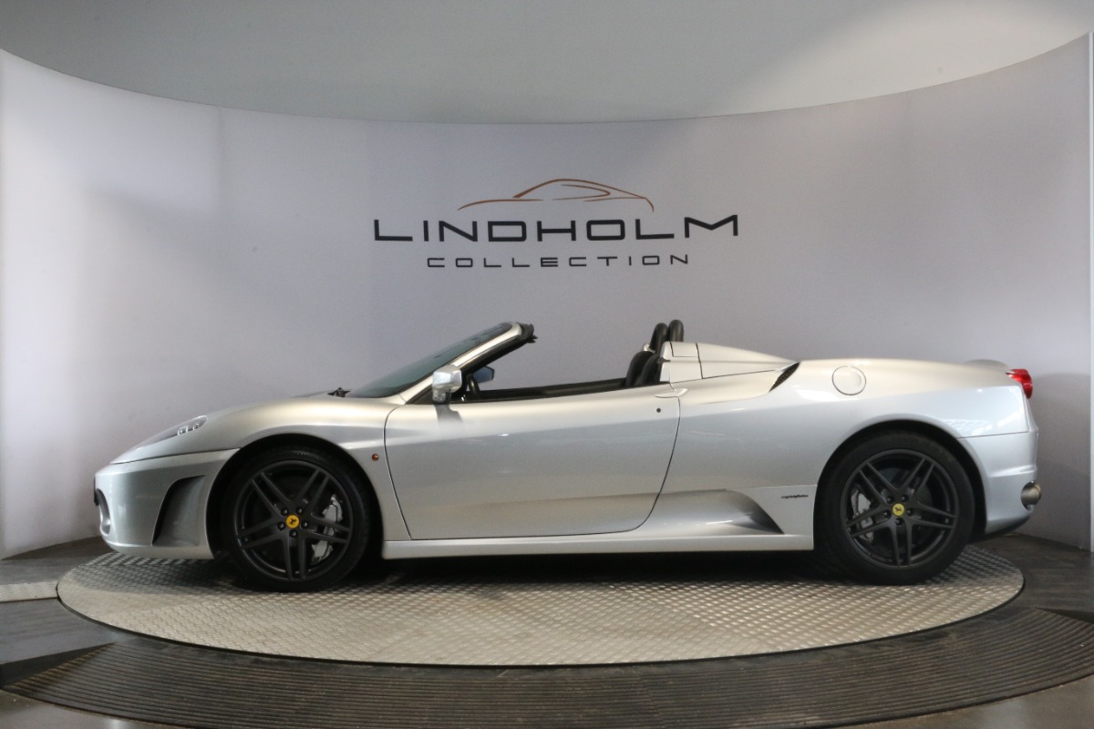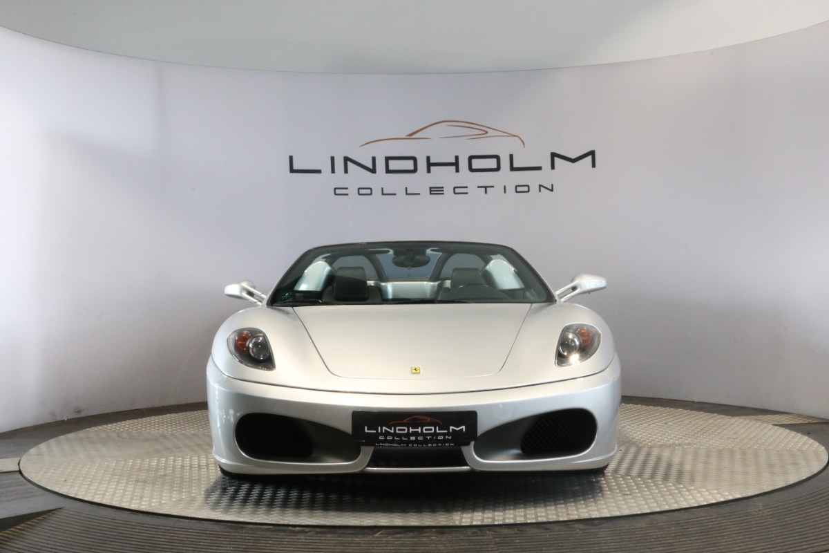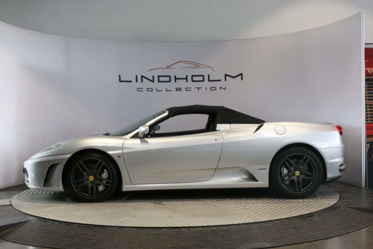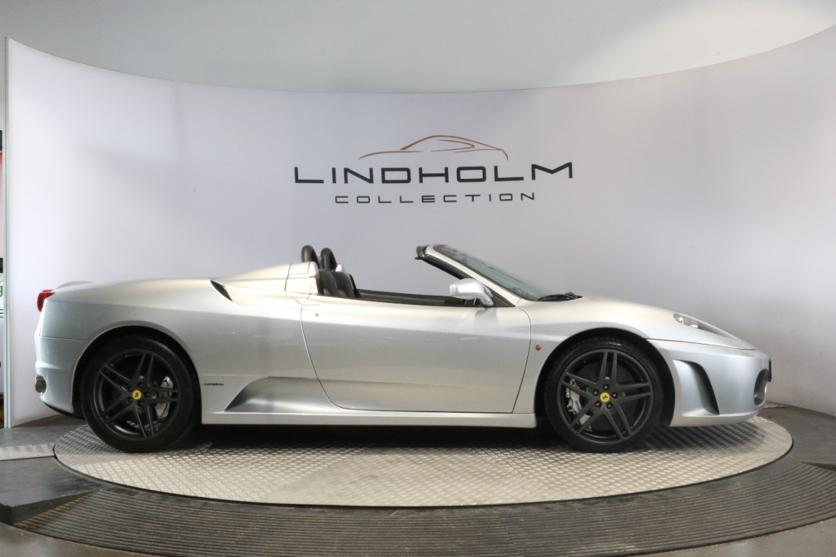 Utrolig fin F430 Spider i Argento Nürburgring og helt rigtig sat sammen med sorte læder "Daytona"-sæder og keramiske bremser, som var et dyrt tilvalg fra ny.