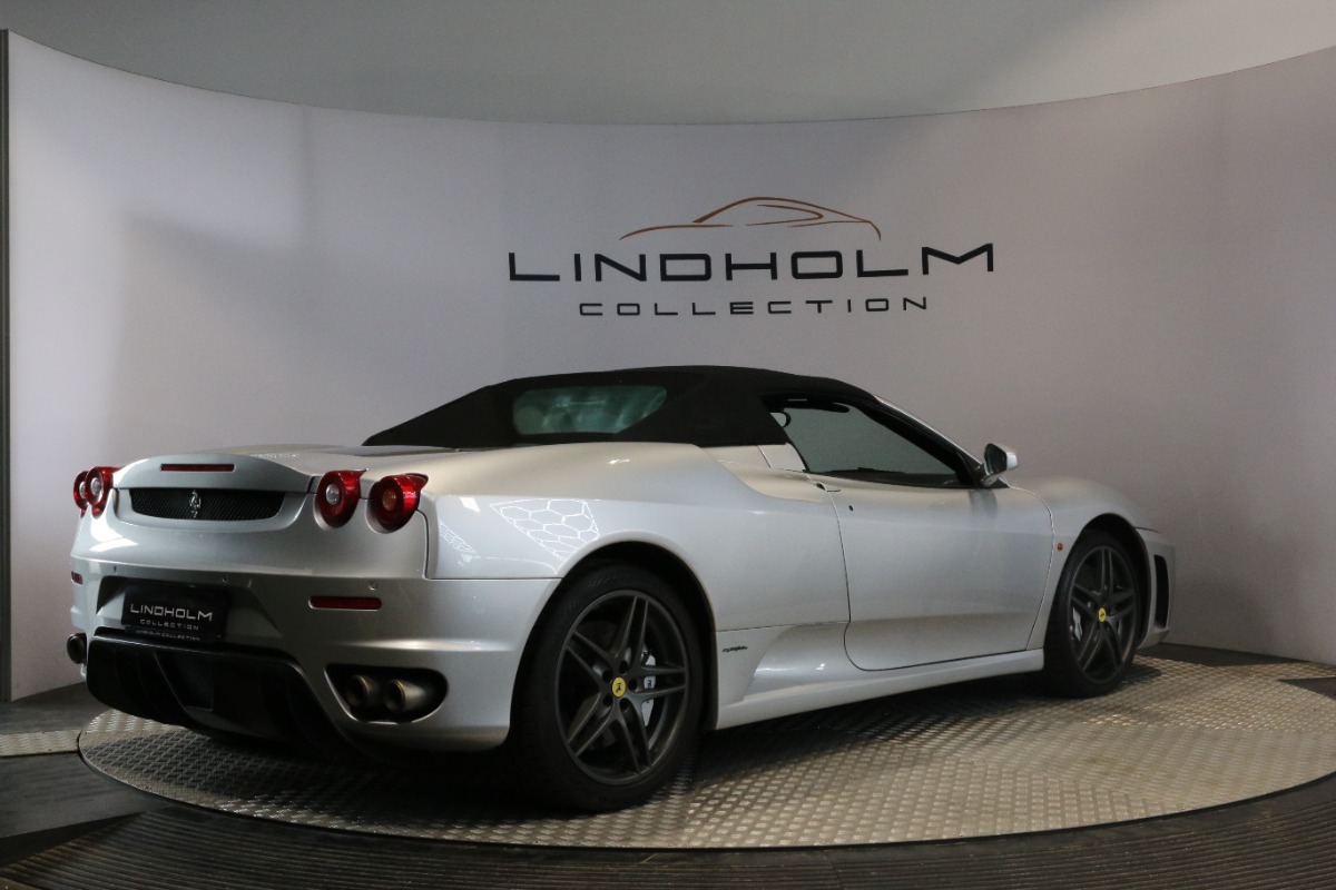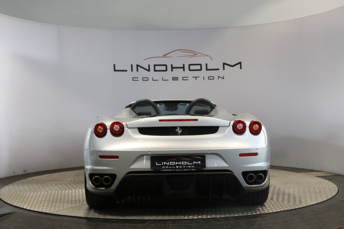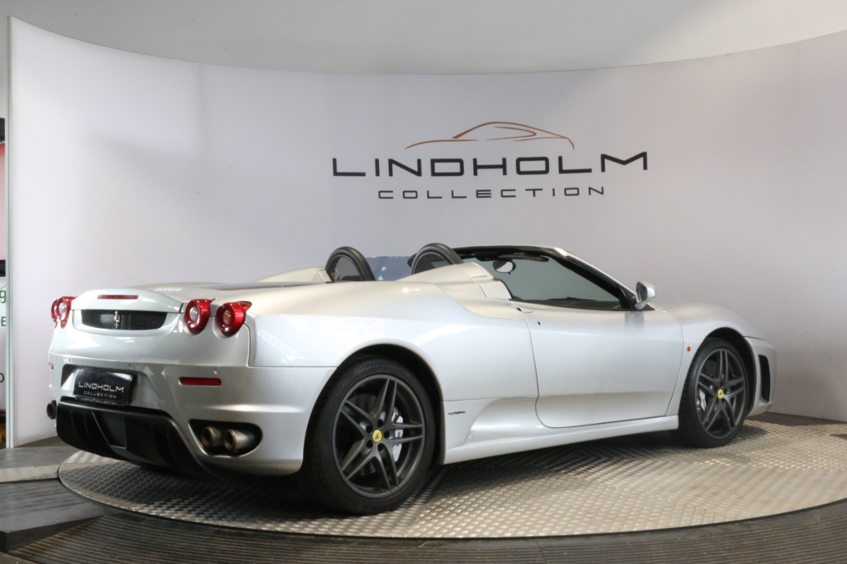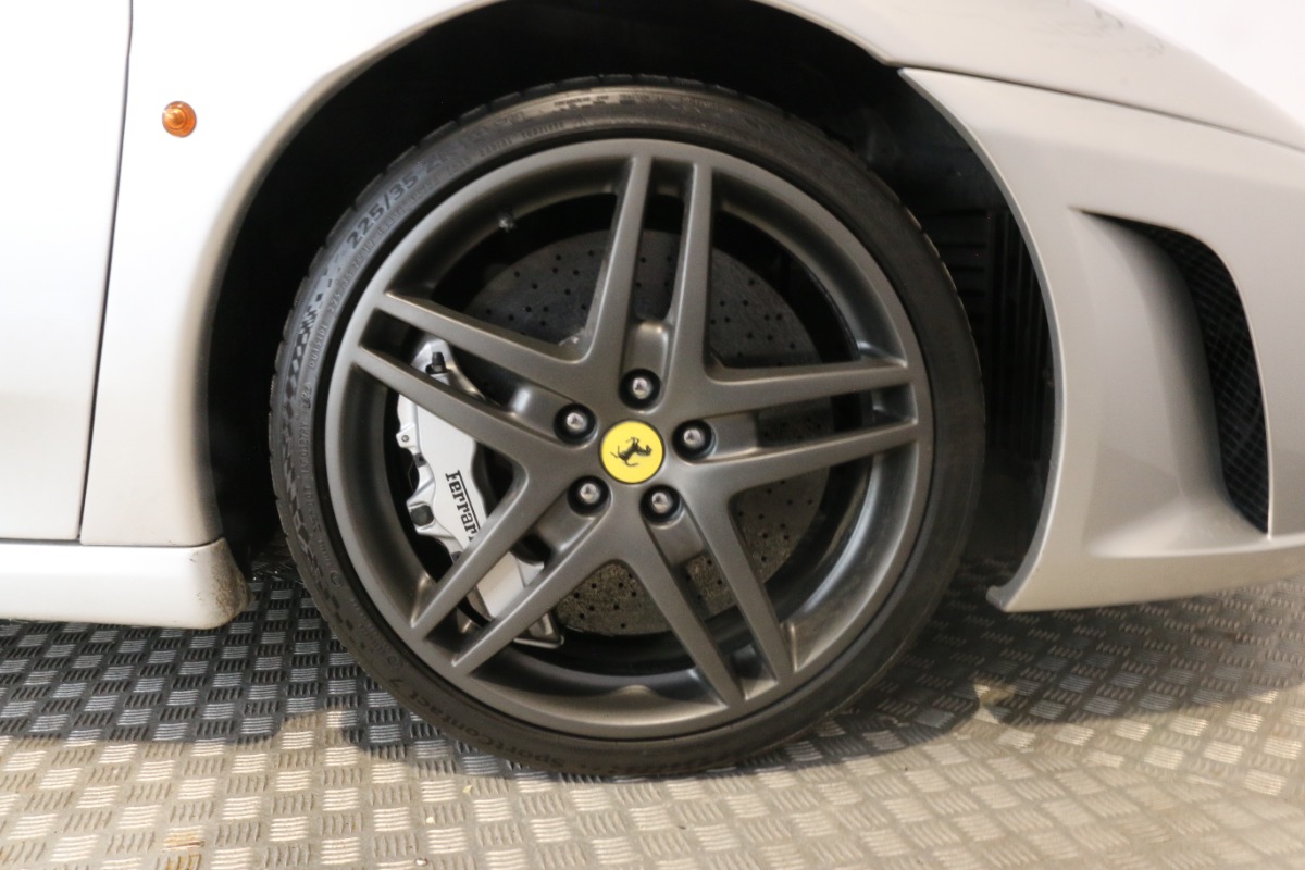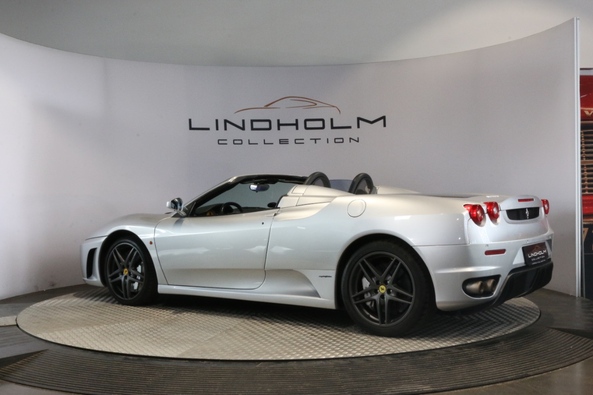 Utrolig fin F430 Spider i Argento Nürburgring og helt rigtig sat sammen med sorte læder "Daytona"-sæder og keramiske bremser, som var et dyrt tilvalg fra ny.