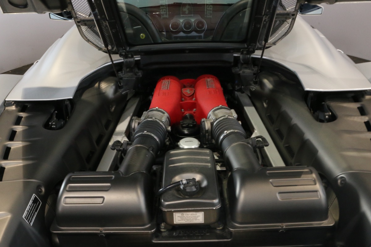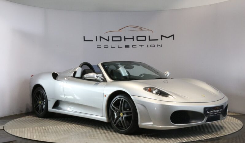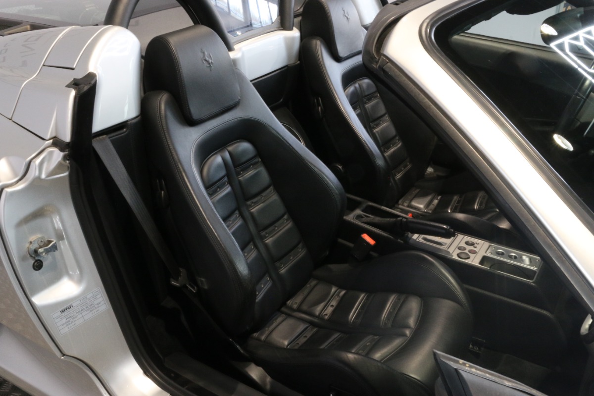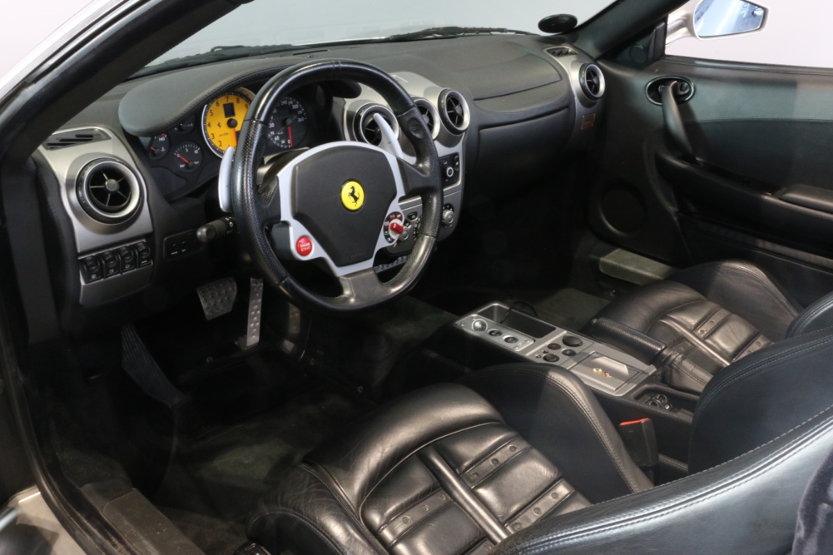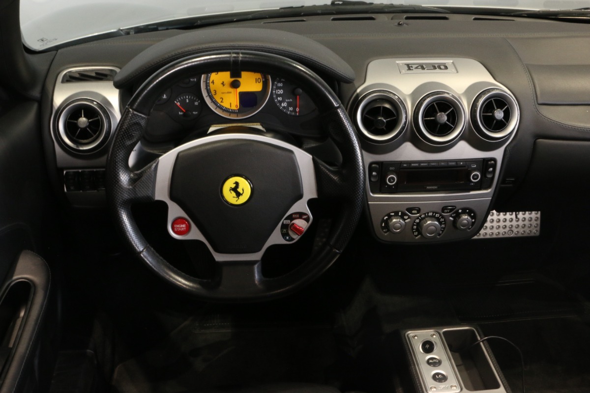 Utrolig fin F430 Spider i Argento Nürburgring og helt rigtig sat sammen med sorte læder "Daytona"-sæder og keramiske bremser, som var et dyrt tilvalg fra ny.