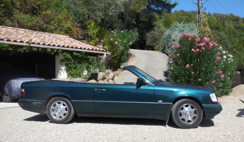 Finald Edition sidste produktion af A 124, E 220 Cabriolet, ganske få eksemplarer. Farve 269 Turmalin grøn, læderindtræk farve 265 Champignon. Original hardtop fra MB, hydraulik, monteret i Stuttgart. Alene 1 ejer/ bruger. Dansk bil fra 01.05.1997 til 01.06.2005 herefter fransk bil. Rustbeskyttet i DK (Pava) 1997, 1999, 2001, 2003 og 2005. Velholdt og velkørende klassisk bil. Aldrig vinterkørt, afmeldt, stået i garage. Ikke en ny bil (29 år), men meget lidt patina,. få ridser alene, lak ikke falmet, lædersæder lidt falmet efter megen sol, kaleche ikke falmet eller revet, stået i garage. Fuld historie. Flere billeder kan fremsendes. Kan beses nær Nice og kan after aftale leveres i DK. Nyd sommeren i MB fra første dag. Sælges alene grundet sælgers alder. Helt original bil. EUR 20.000. Alene seriøse henvendelser.
