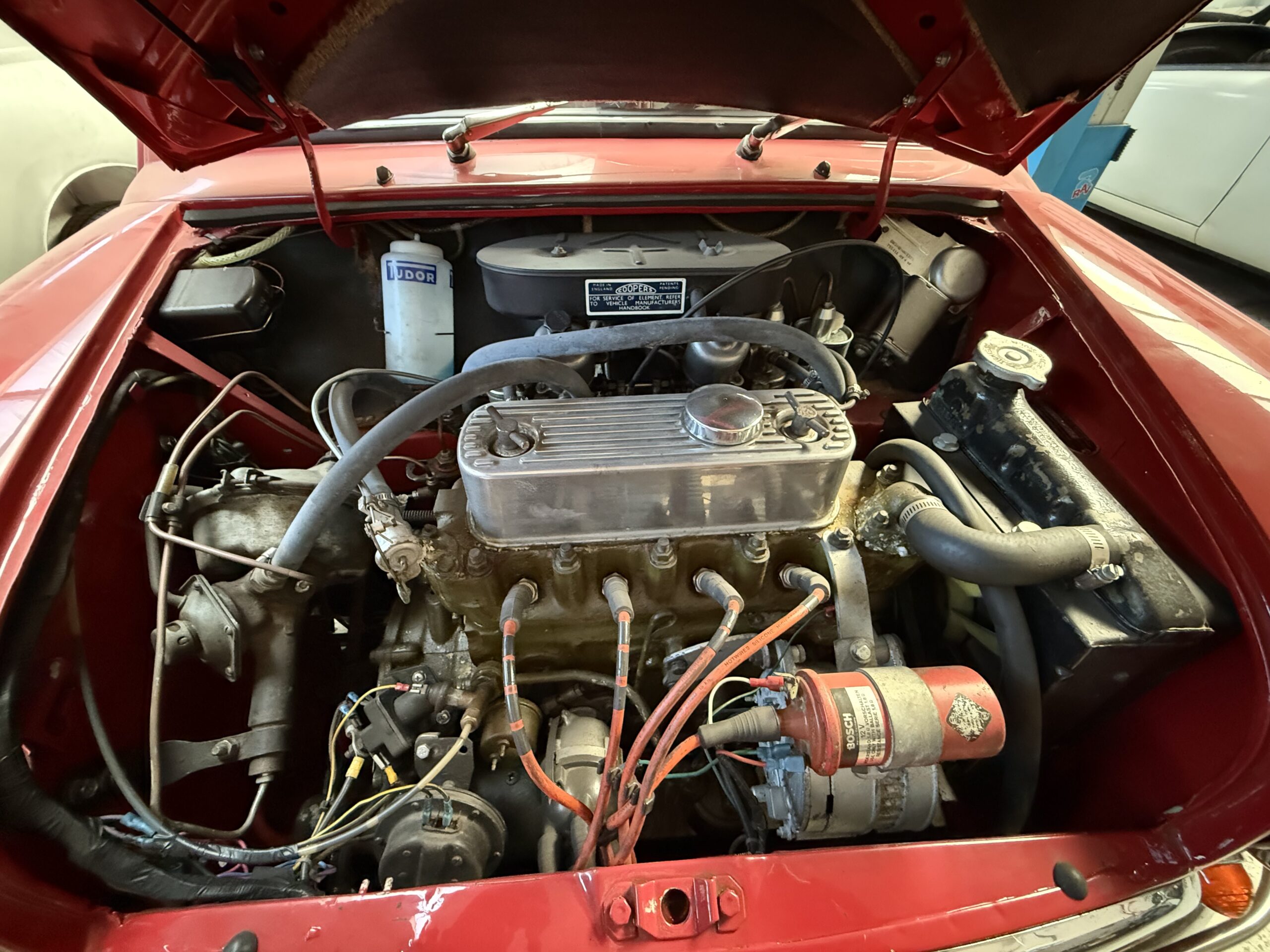 Original Morris Cooper S, 1275ccm fra 1964 sælges, serierigtig motor med de rigtige dele og 333 gearkasse medfølger som samlesæt (så man kan se hvad man har med at gøre) alm 1275 motor installeret, starter/kører.