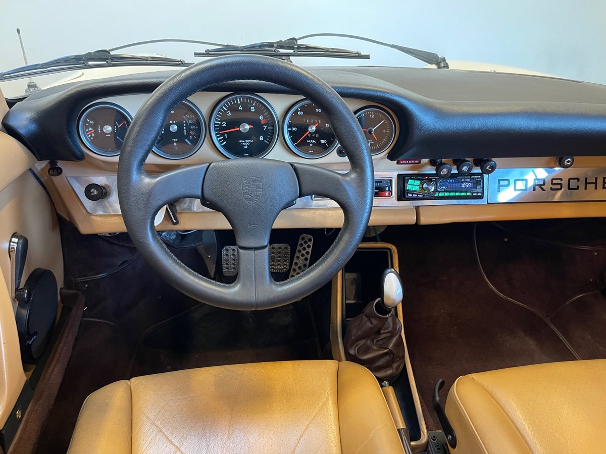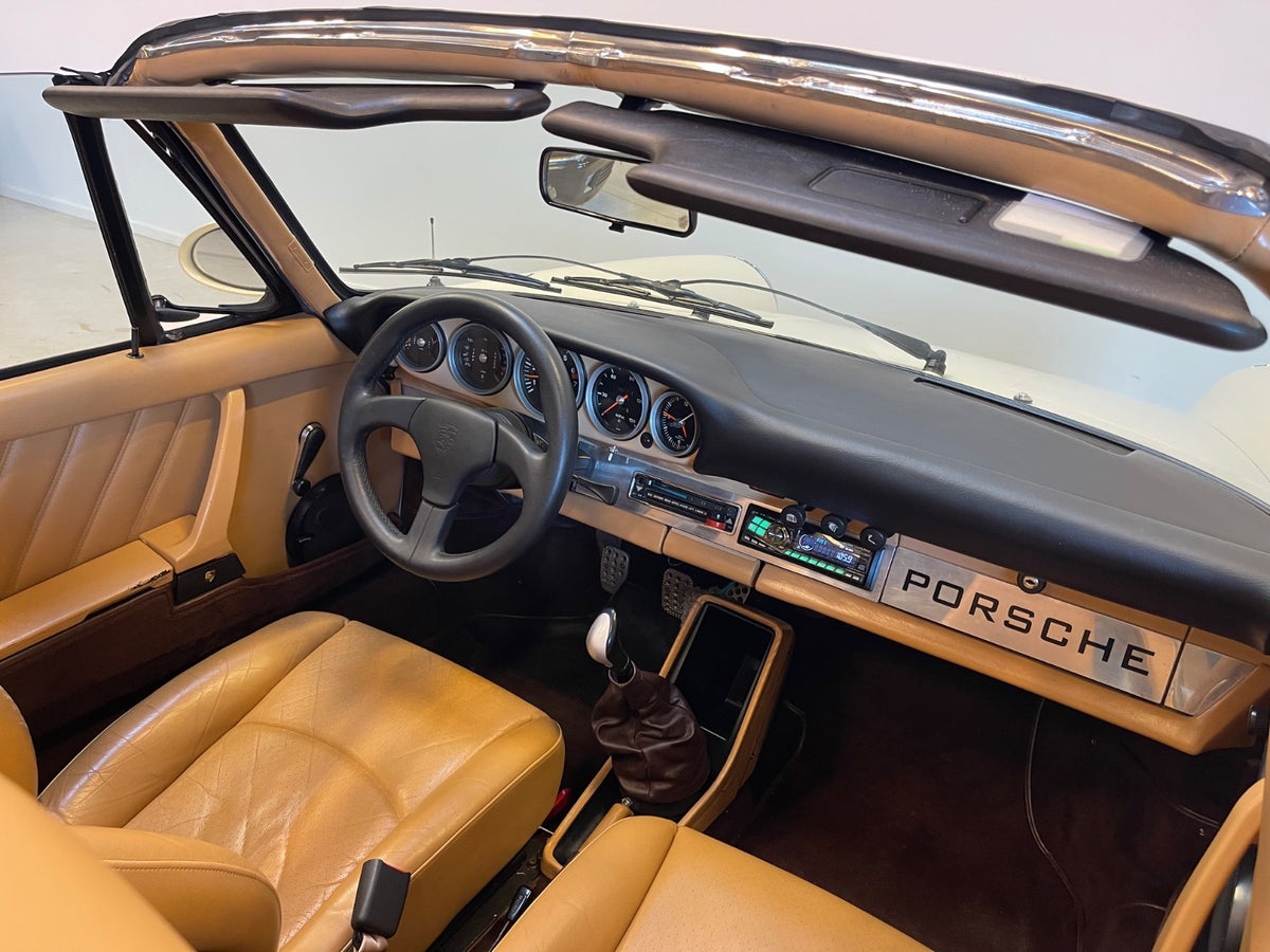 Nyere tæppesæt, creme læderkabine, hvide tågelygter, hævet ratnav ab fabrik, opgraderet Pioneer radio, opgraderet anlæg m. Infity højtalere for & bag, nyere ombetrukket Targa-tag, cigartænder, originalt grøntonede ruder, matching numbers!